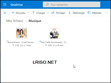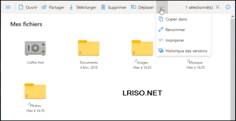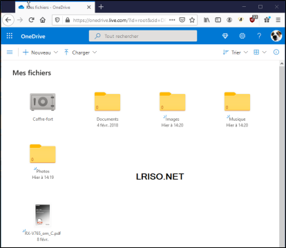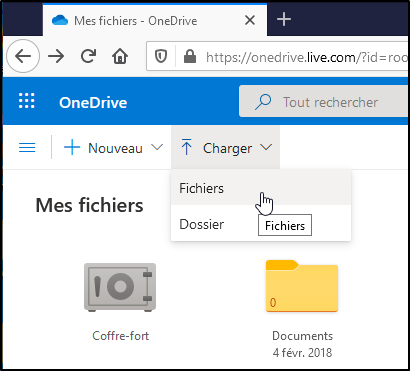 8. Pour envoyer des fichiers sur votre espace OneDrive, placez-vous dans le dossier où les mettre et cliquez sur le bouton Charger. Sélectionnez Fichier pour choisir un ou plusieurs fichiers. Pour sélectionner un dossier et son contenu, cliquez sur Dossier.