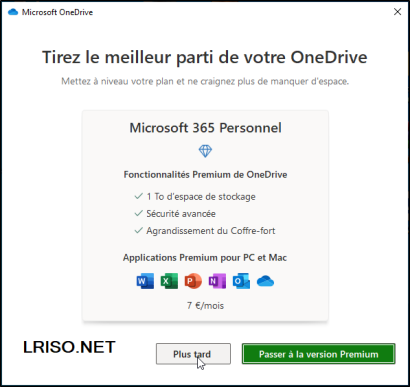 9. OneDrive vous propose de passer à Office 365 avec Word, Excel, … et 1 To d'espace de stockage pour 7 € / mois. Déclinez l'offre.