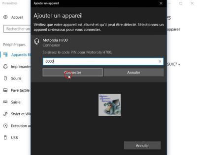 7. Saisissez le code PIN de votre appareil (si celui-ci vous est demandé). Généralement, il s'agit de "0000" et cliquez sur Connecter.
