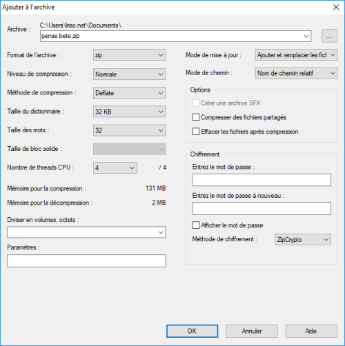 7. Si vous souhaitez contrôler plus précisément la création de l'archive, cliquez sur Ajouter à l'archive. Vous pourrez alors choisir un autre nom de fichier, définir le format à utiliser pour l'archive, son taux de compression, découper le fichier en plusieurs morceaux, définir un mot de passe, etc.
