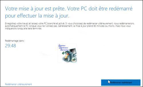 4 Une fois la copie terminée, votre ordinateur doit redémarrer. L'assistant vous laisse 30 minutes avant de procéder automatiquement au redémarrage. Vous pouvez fermer maintenant les programmes et documents ouverts cliquez sur Redémarrer maintenant pour continuer.