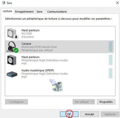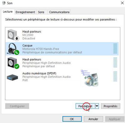 4. Sélectionnez votre périphérique Bluetooth et la qualité souhaitée dans la liste puis cliquez sur Par défaut.