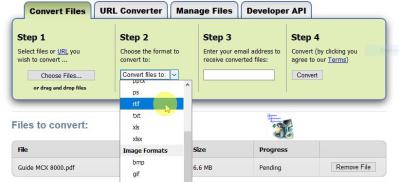 4. Déroulez la liste dans la zone Step 2 et choisissez le format dans lequel convertir le PDF : rtf pour de meilleurs résultats (format compatible avec Word). Vous pouvez aussi essayer doc pour le format Word ou odt pour le format OpenOffice.